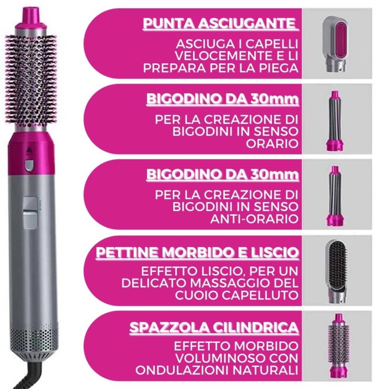 Lo styler professione Hot Airstyler riunisce in 5 accessori tutto il necessario per ogni tipo di acconciatura con effetto professionale.